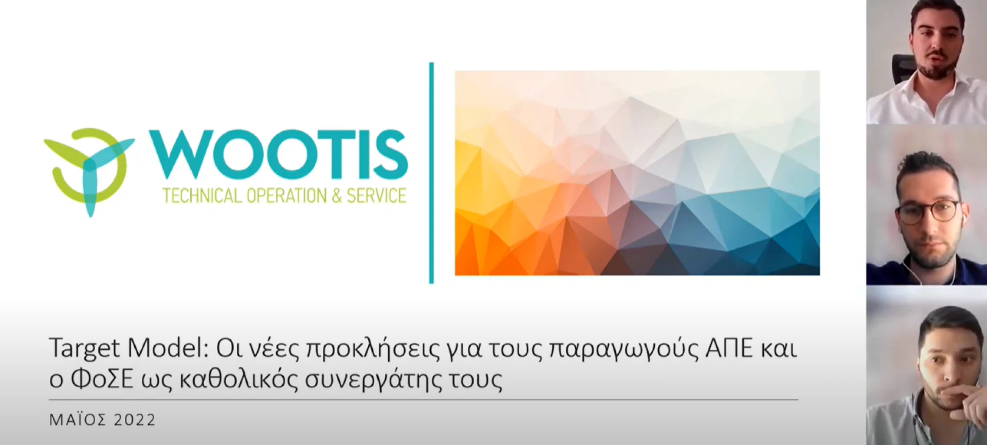 Την Τετάρτη 11 Μαΐου, πραγματοποιήθηκε το ενημερωτικό Webinar της Wootis με το θέμα «Target Model: Οι νέες προκλήσεις για τους παραγωγούς ΑΠΕ και ο ΦοΣΕ ως καθολικός συνεργάτης τους». Οι ομιλητές κ. Παπαθεοδώρου και κ. Βαβουράκης ανέλυσαν την υφιστάμενη κατάσταση και τη μελλοντική εξέλιξη των αγορών ενέργειας, καθώς και τις δυνατότητες που έχουν οι παραγωγοί ΑΠΕ σε αυτό το περιβάλλον και πώς θα μπορούσαν να προσαρμοστούν έγκαιρα στις νέες απαιτήσεις.